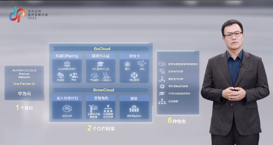 大会期间,华为云发布新伙伴体系加速伙伴成长,具体包含1个统一身份、2个合作框架(GoCloud及GrowCloud)和6种伙伴角色(数字化转型咨询与系统集成、软件、服务、硬件设备、学习与赋能、总经销商),全面加速伙伴成长。