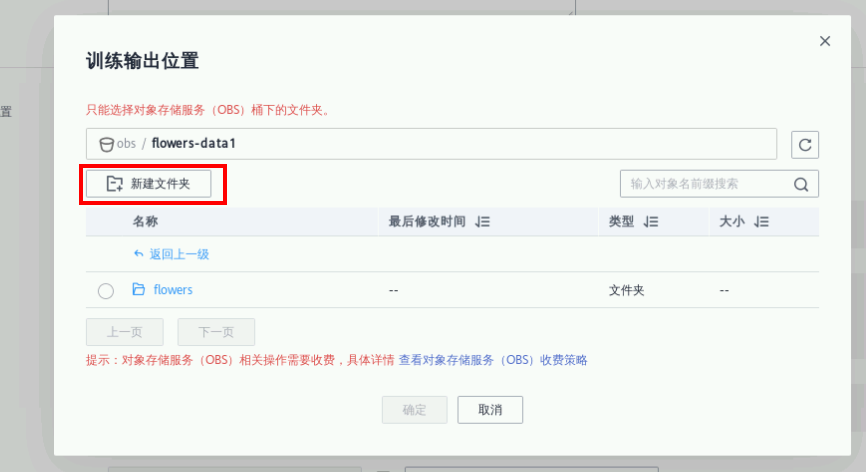 看上面填,完成回到对象存储服务列表,然后点击刚刚创建的OBS桶名称进入详情页,选择左侧“对象”->“新建文件夹”(存放后续步骤的数据文件),名称任意(请记住此名称以备后续相关步骤使用),点击“确定”,如下图: