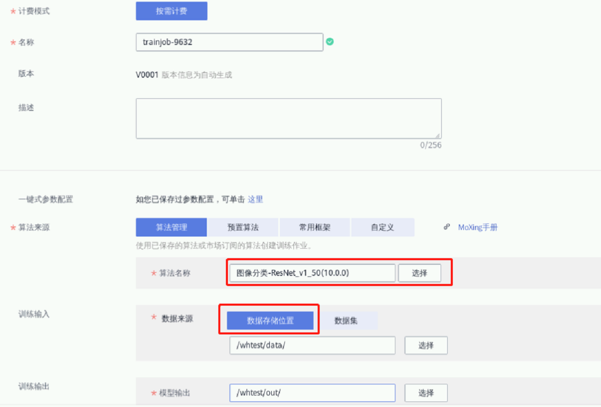 ② “算法来源”中的“算法管理”,算法名称默认为之前选择的算法