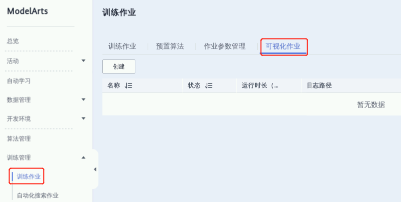① 在“训练作业”界面,点击“可视化作业”,再点击“创建”按钮;