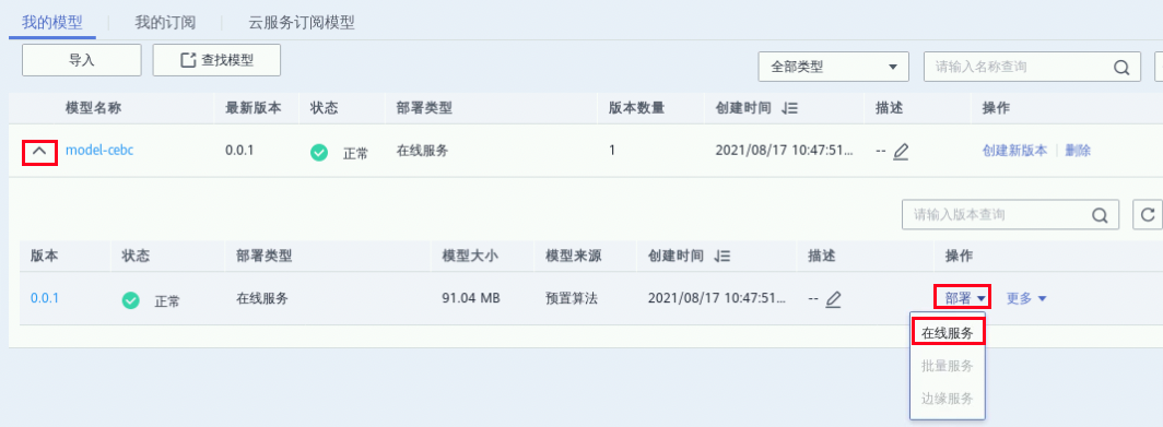 点击已创建模型名称前的下拉箭头,点击操作列中【部署】,选择部署菜单栏中的【在线服务】。或点击模型名称进入模型详情页,点击详情页右上角的【部署】,在部署菜单中选择【在线服务】;