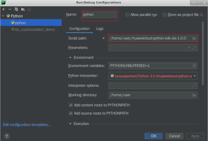 然后添加程序配置文件,“Add Configuration”->“+”->Name:“python”-> Path:“Python SDK默认解压目录路径:/home/user/huaweicloud-python-sdk-sis-1.0.0”-> OK
