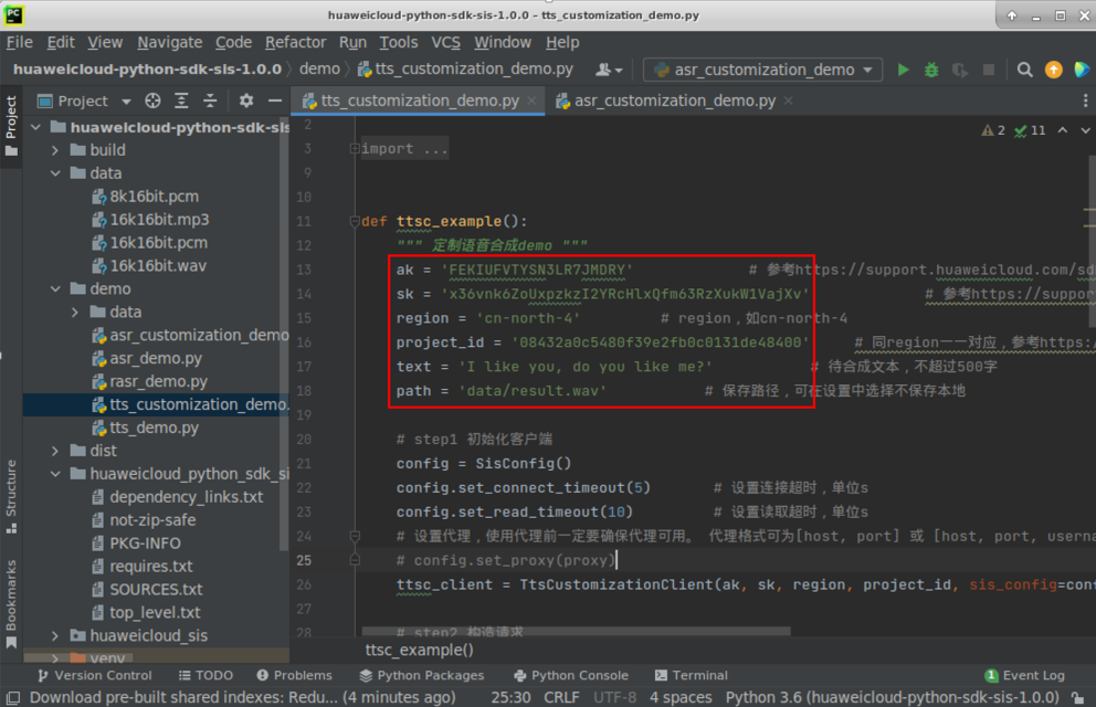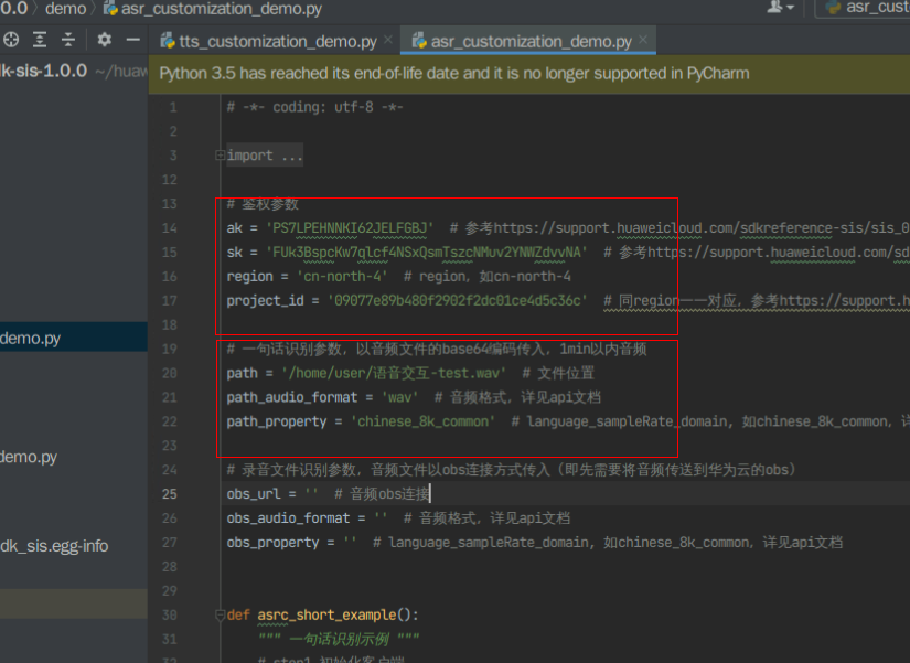 你可以在Pycharm中打开 “demo”文件夹下“asr_customization_demo.py”, 修改代码中的ak, sk,region和project_id,将其后面的内容改为步骤2“获取AK、SK、项目ID”中拿到的ak, sk和project_id,以及region改为“cn-north-4”;
