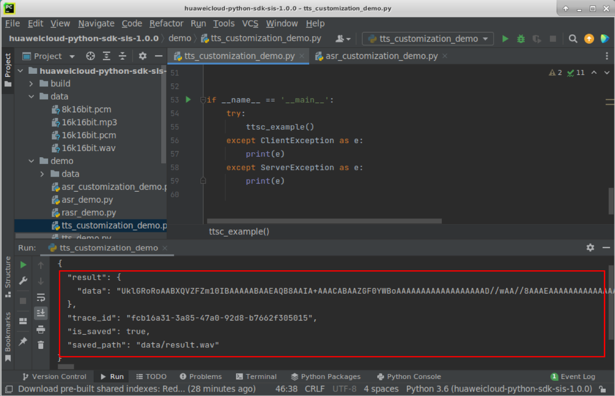 然后调用语音合成API,trace_id代表服务内部的令牌,可用在日志中追溯具体流程,调用失败无此字段,在某些错误情况下可能没有此令牌字符串;result代表调用成功,表示识别结果,调用失败时无此字段。data代表语音数据,base64编码格式返回就行;