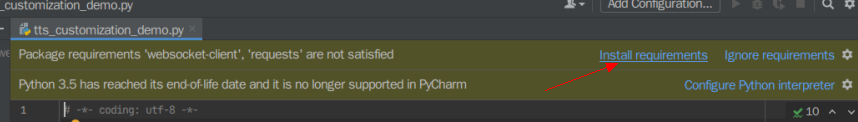 点击黄色提示Install requirements, 切勿点击ignore否则导致实验失败