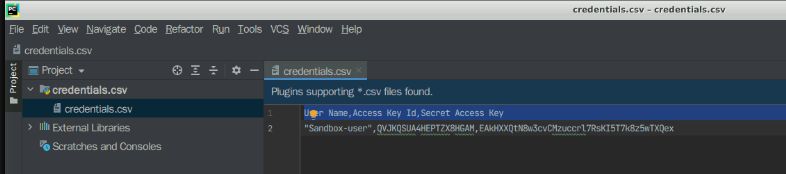 ④ 最后完成后会生成credentials.csv文件,然后点击“立即下载”,文件会下载到/home/user/Downloads/路径下,下载完成后,右击文件选择“用‘Pycharm’打开” ,可查看对应的AK、SK信息,这样咱们就能用,如下这样
