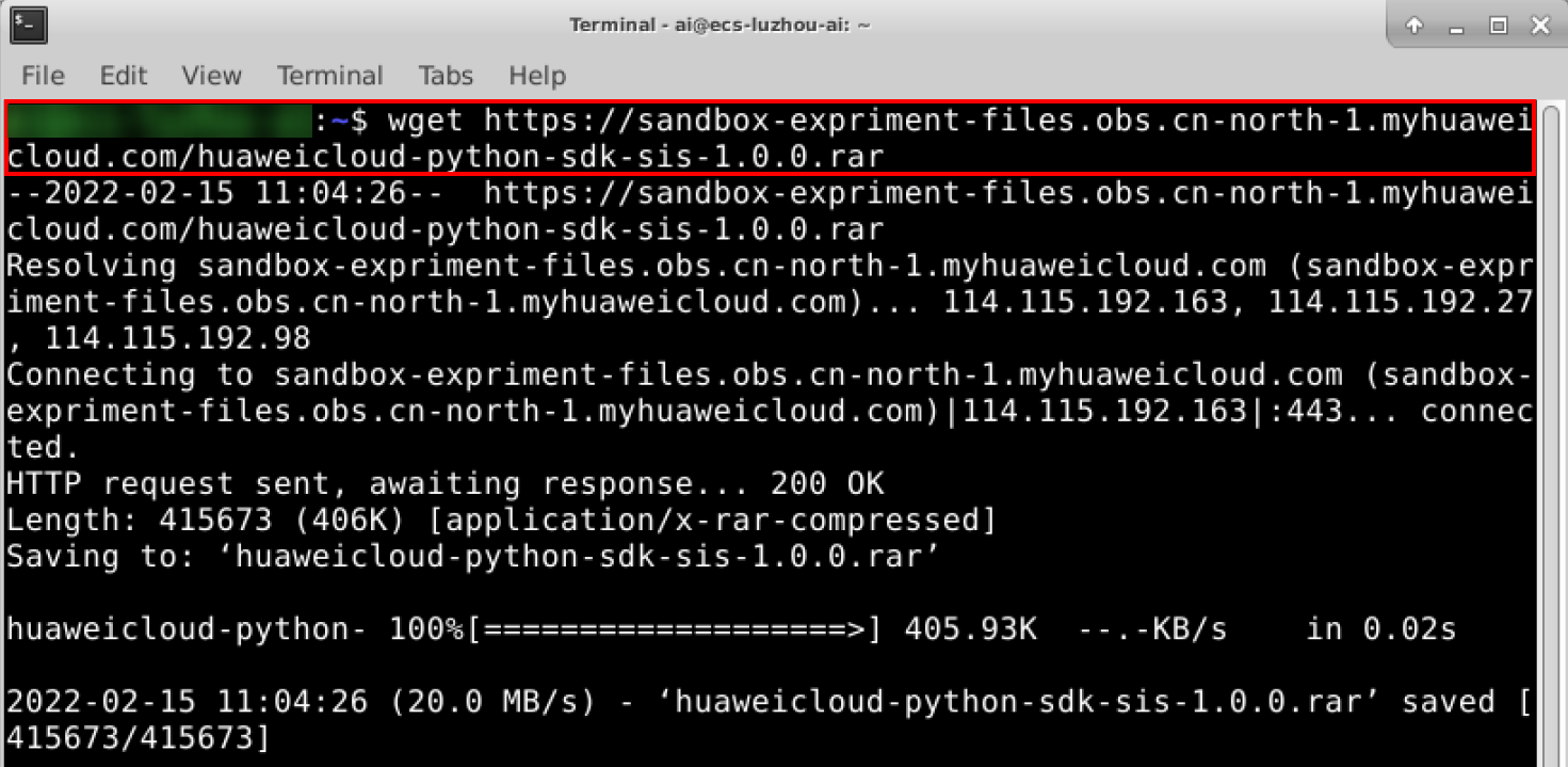 wget https://sandbox-expriment-files.obs.cn-north-1.myhuaweicloud.com/huaweicloud-python-sdk-sis-1.0.0.rar