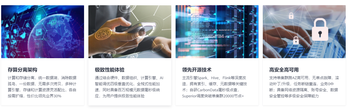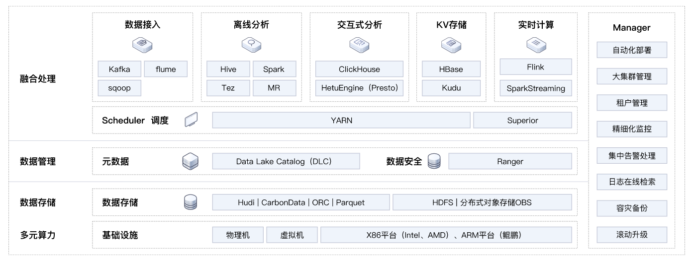 为客户提供Hudi、ClickHouse、Spark、Flink、Kafka、HBase等Hadoop生态的高性能大数据组件,支持数据湖、数据仓库、BI、AI融合等能力。