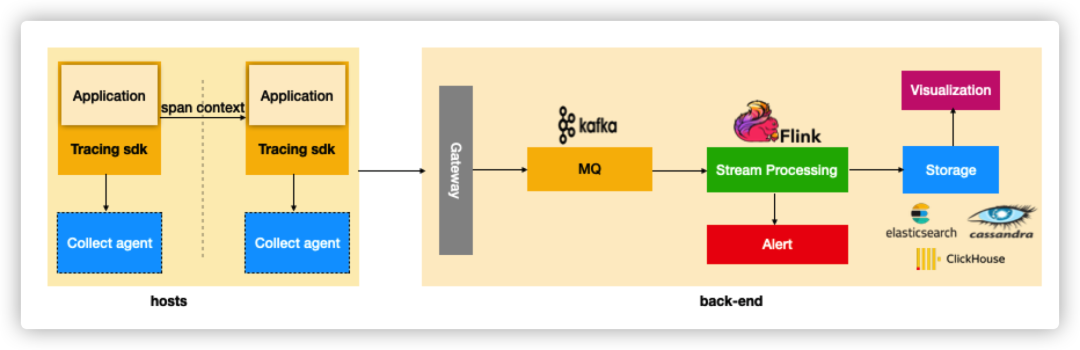 - Collect agent 一般是在靠近应用侧的一个边缘计算层,主要用于提高 Tracing Sdk 的写性能,和减少 back-end 的计算压力;