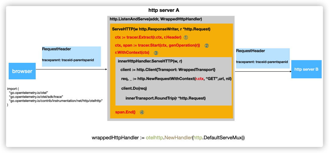① ctx := tracer.Extract(r.ctx, r.Header):从请求的 header 中提取 traceparent header 并解析,提取 TraceId和 SpanId,进而构建 SpanContext 对象,并最终存储在 ctx 中;