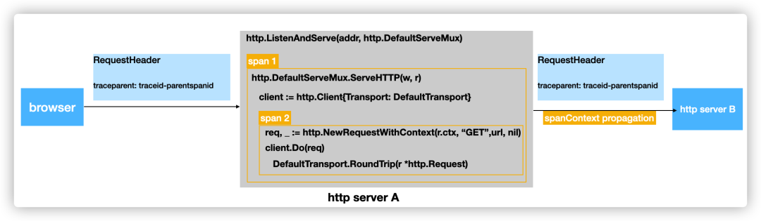 - Span2,记录 httpServer 处理请求过程中,发起的另一个到 serverB 的 http 请求的耗时情况
