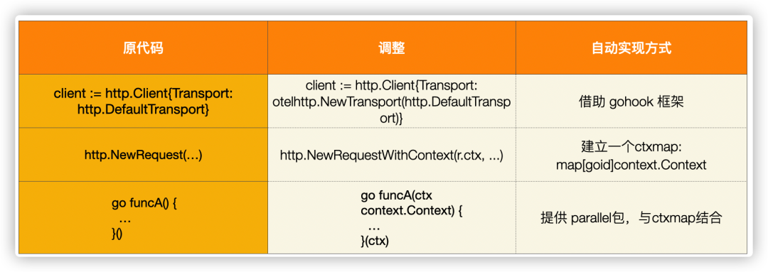 上图列出了现在可能的一些无侵入集成的实现思路,与 .net、java 这类有 IL 语言的编程语言不同,go 直接编译为机器码,导致无侵入的方案实现起来相对比较麻烦,具体有如下几种思路: