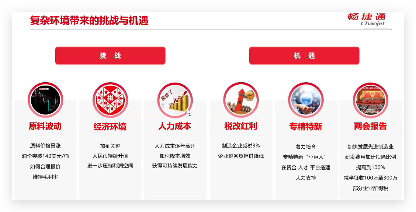 复杂环境带来的挑战与机遇,原料波动、经济环境、人力成本、税改红利、专精特新、两会报告等。