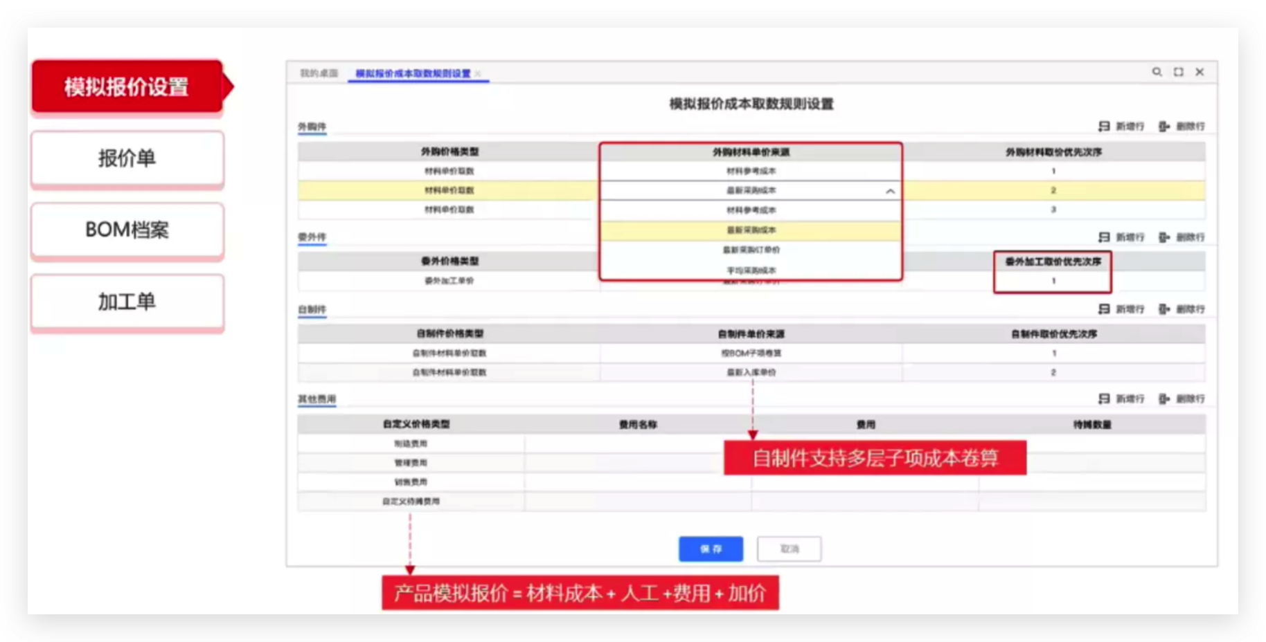 - 多种取价来源:支持按外购件、委外件、自制件,分别设𡸽取价来源,如外购件独有的最新采购成本、委外件独有的委外加工单价,每种价格可设置取价优先级,保障每种产品均可取价;