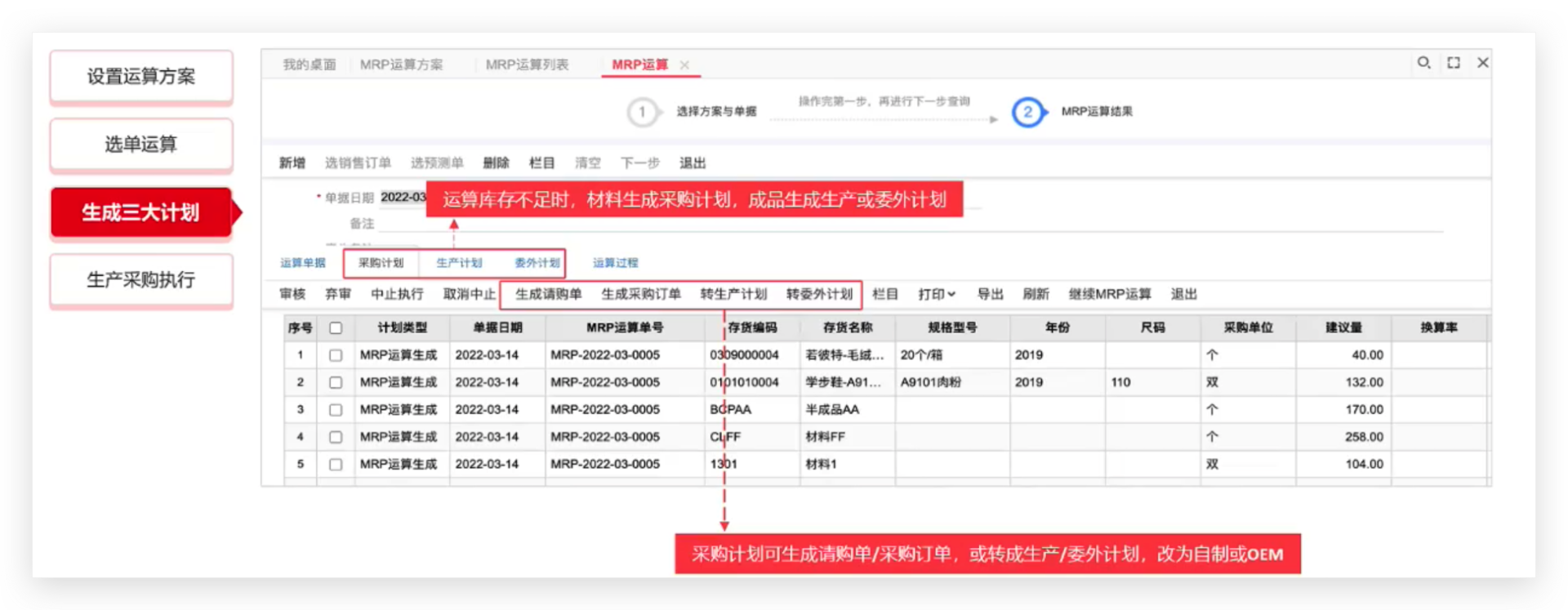 利用物料需求计划(MRP)根据业务需求以及库存情况综合运算,得到详细生产计划、委外计划、采购计划,指导车间、采购部门步调一致,多组织间紧密协作,规避发货逾期、缺料等问题