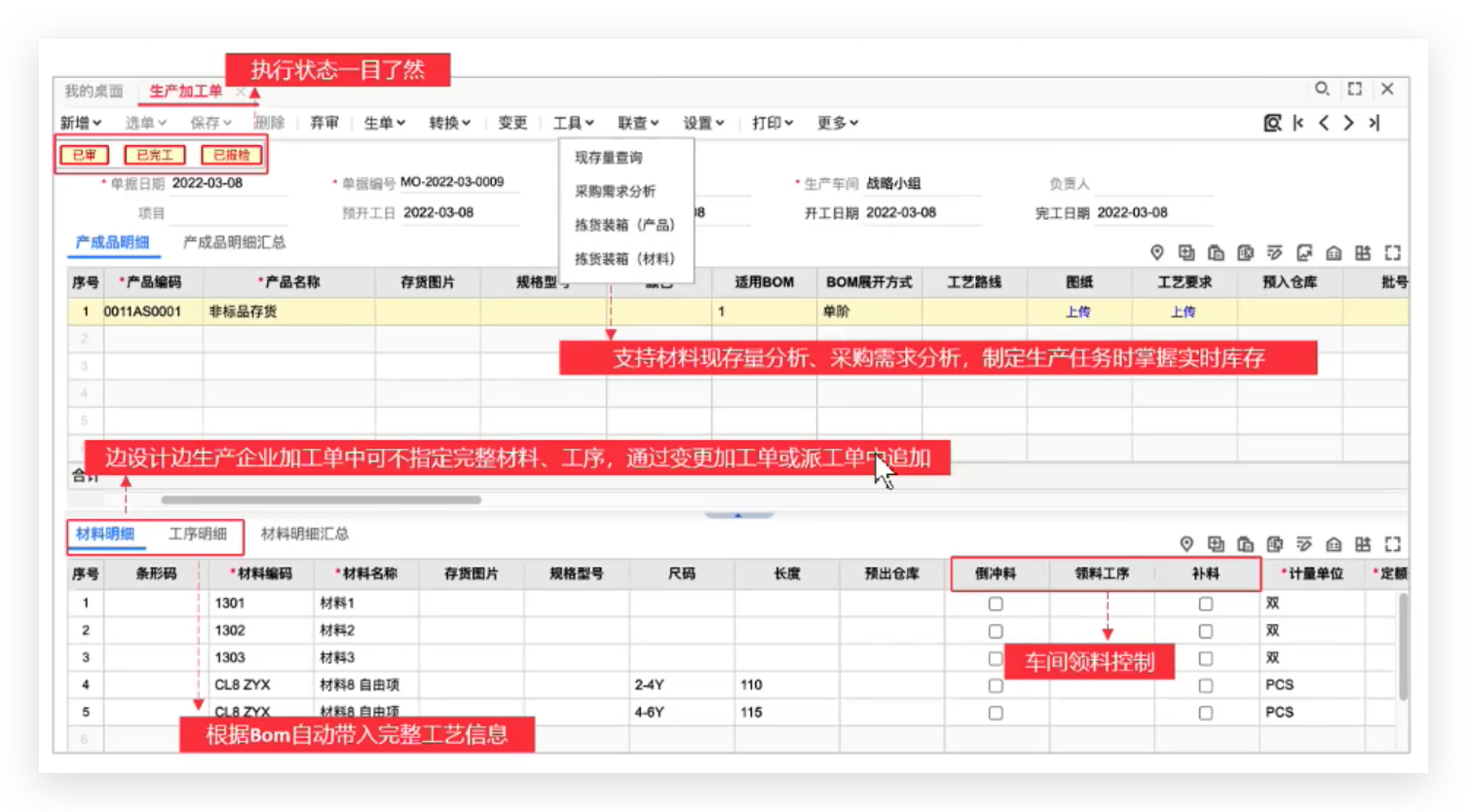 为加工工序指定生产需要领用的材料,也可临时增加BOM中没有的材料;