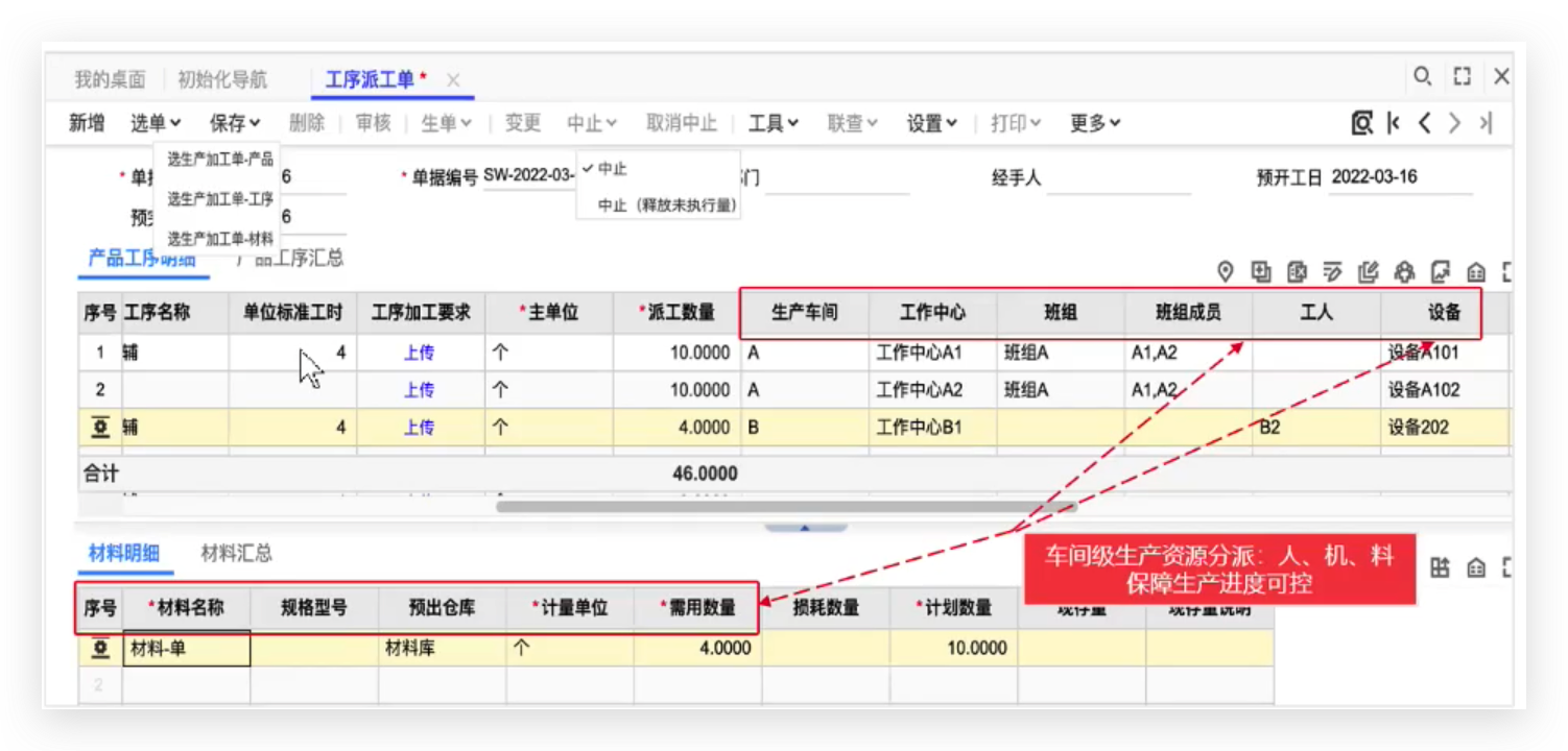 派工任务未完成时可进行中止, 中止后未加工数量可继续派工也可不在派工