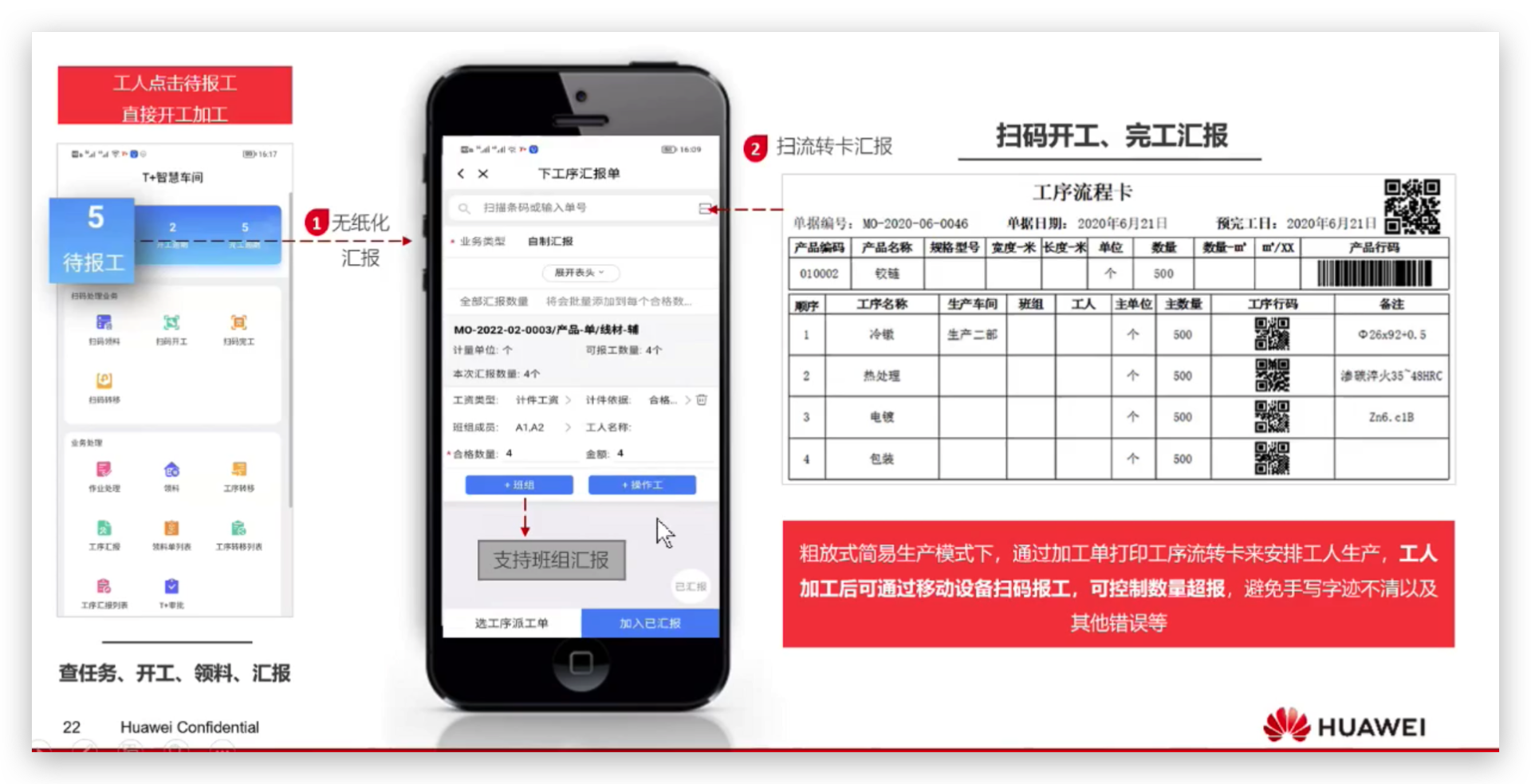 粗放式简易生产模式下,通过加工单打印工序流转卡来安排工人生产,工人加工后可通过移动设备扫码报工,可控制数量超报,避免手写字迹不清以及其他错误等。