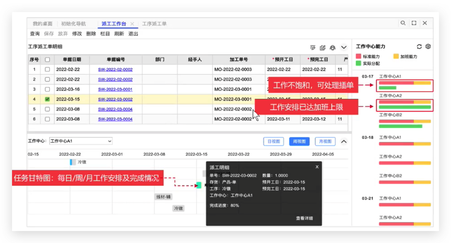 工作日历中设置工作中心标准工作小时数、可加班小时数后可生成日工作能力,根据派工任务的标准工时可计算日分配产能,通过日工作能力与分配产能对比, 可评估工作中心工作饱和情况。
