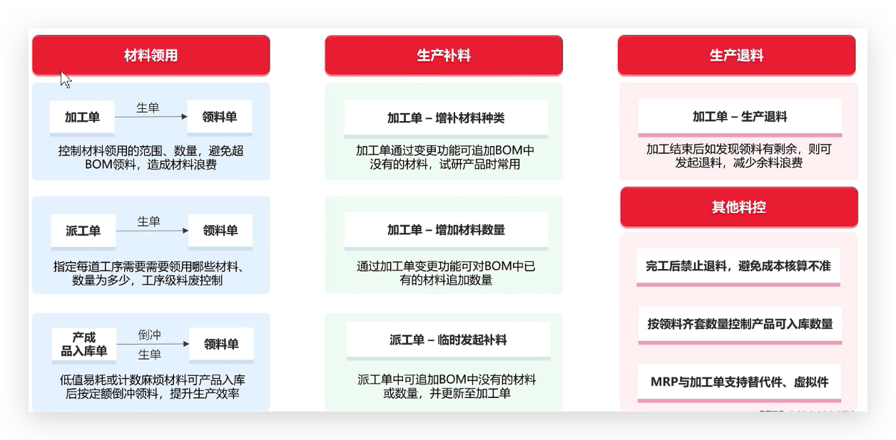 工人不知道该领什么材料、领用多少、超定额领用时无法控制,补料、退料记录不准确,料耗分析时数据不精准低值易耗材料倒冲手工管理难度大,账实不符;
