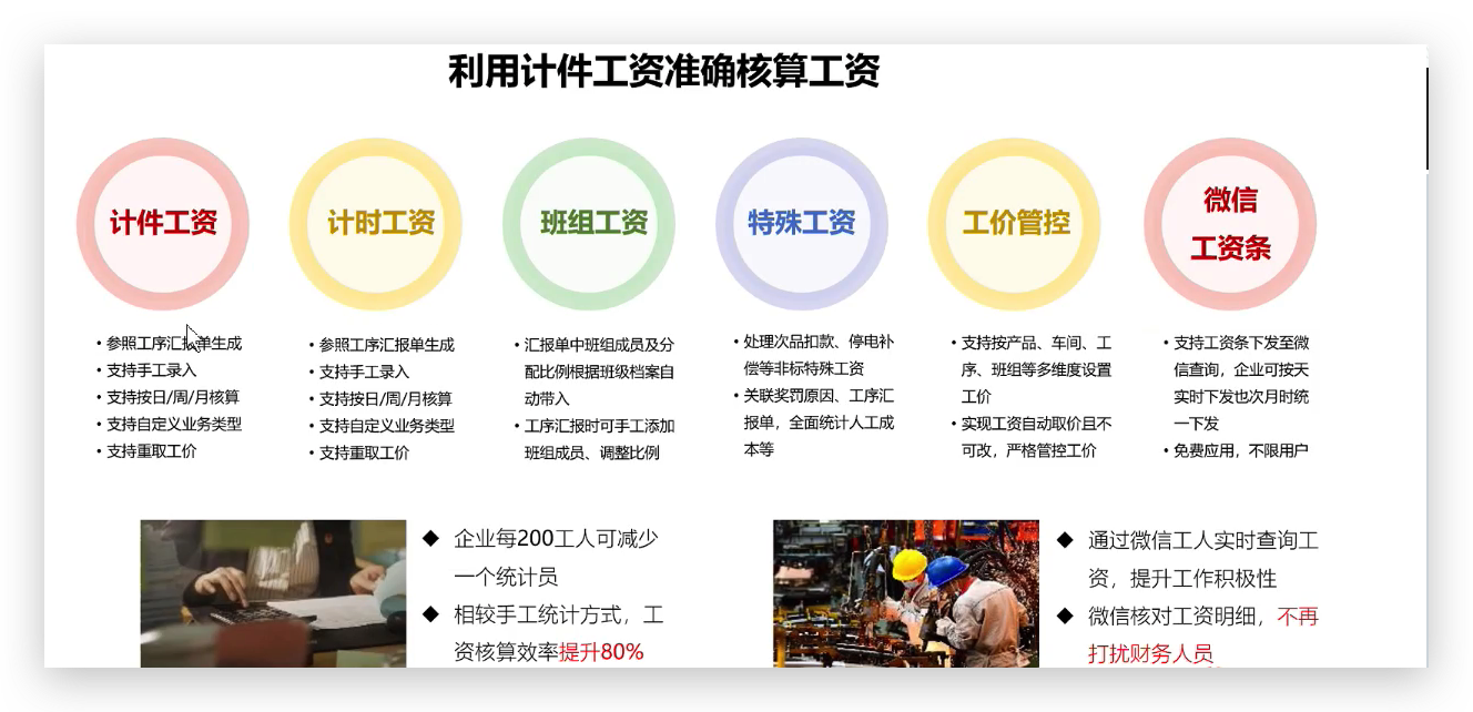 企业每200工人可减少一个统计员,相较手工统计方式,工资核算效率提升80%,通过微信工人实时查询工资,提升工作积极性微信核对工资明细,不再打扰财务人员。