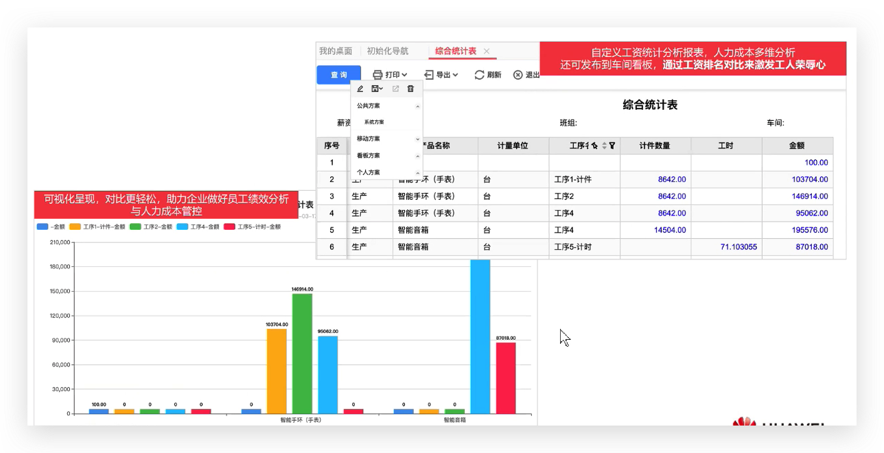 自定义工资统计分析报表,人力成本多维分析,还可发布到车间看板,通过工资排名对比来激发工人荣辱心。