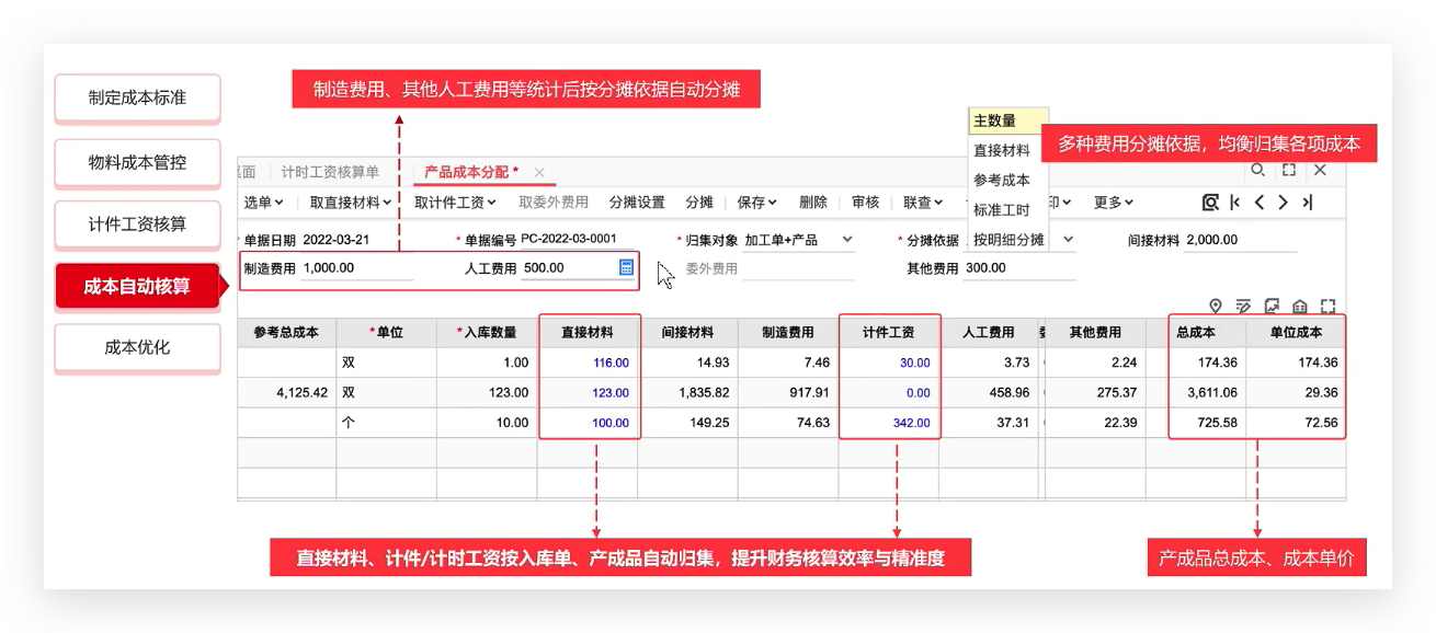直接材料、计件/计时工资按入库单、产成品自动归集,提升财务核算效率与精准度。