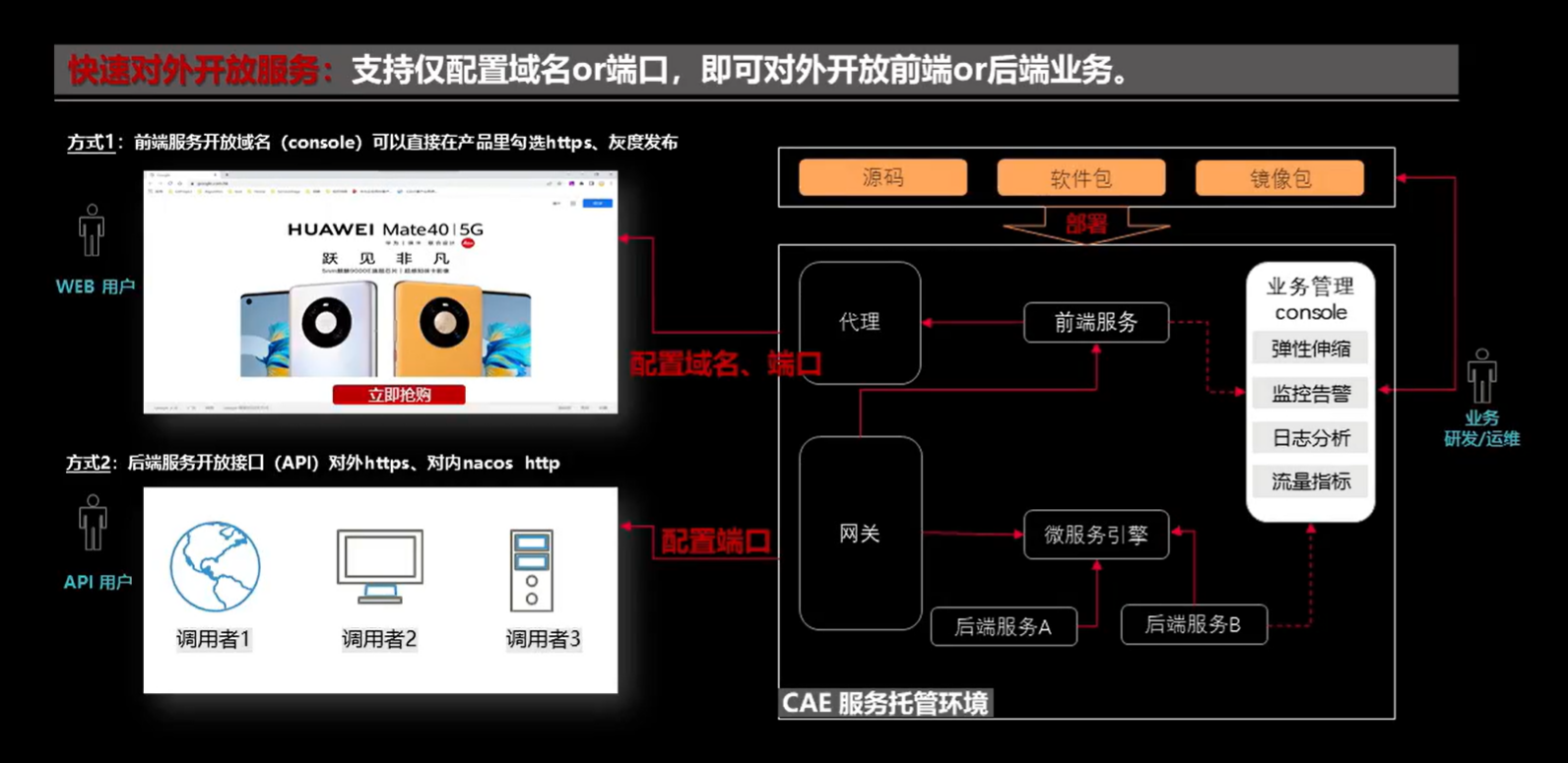 任何新概念新技术的落地实现,本质上都是要和具体业务去结合,去真正解决具体业务问题。华为云应用引擎CAE可以帮助客户无需理解云技术,即可享受云托管。其支持多种常见业务形态一键部署上云、 快速对外开放服务、极致弹性伸缩等众多优势,给客户带来无限便利。