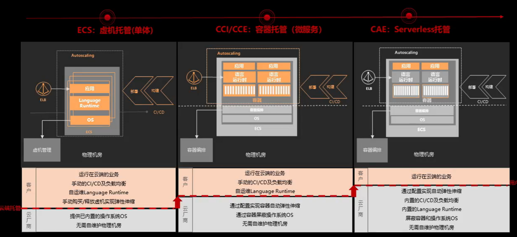 随着应用托管发展成容器托管,最后演变为Serverless托管。这个时候,客户只需要关注运行在云端的这一个业务,其他的任务全部让云厂商去完成,极大了减轻了客户的任务量,让客户更关注业务本身。