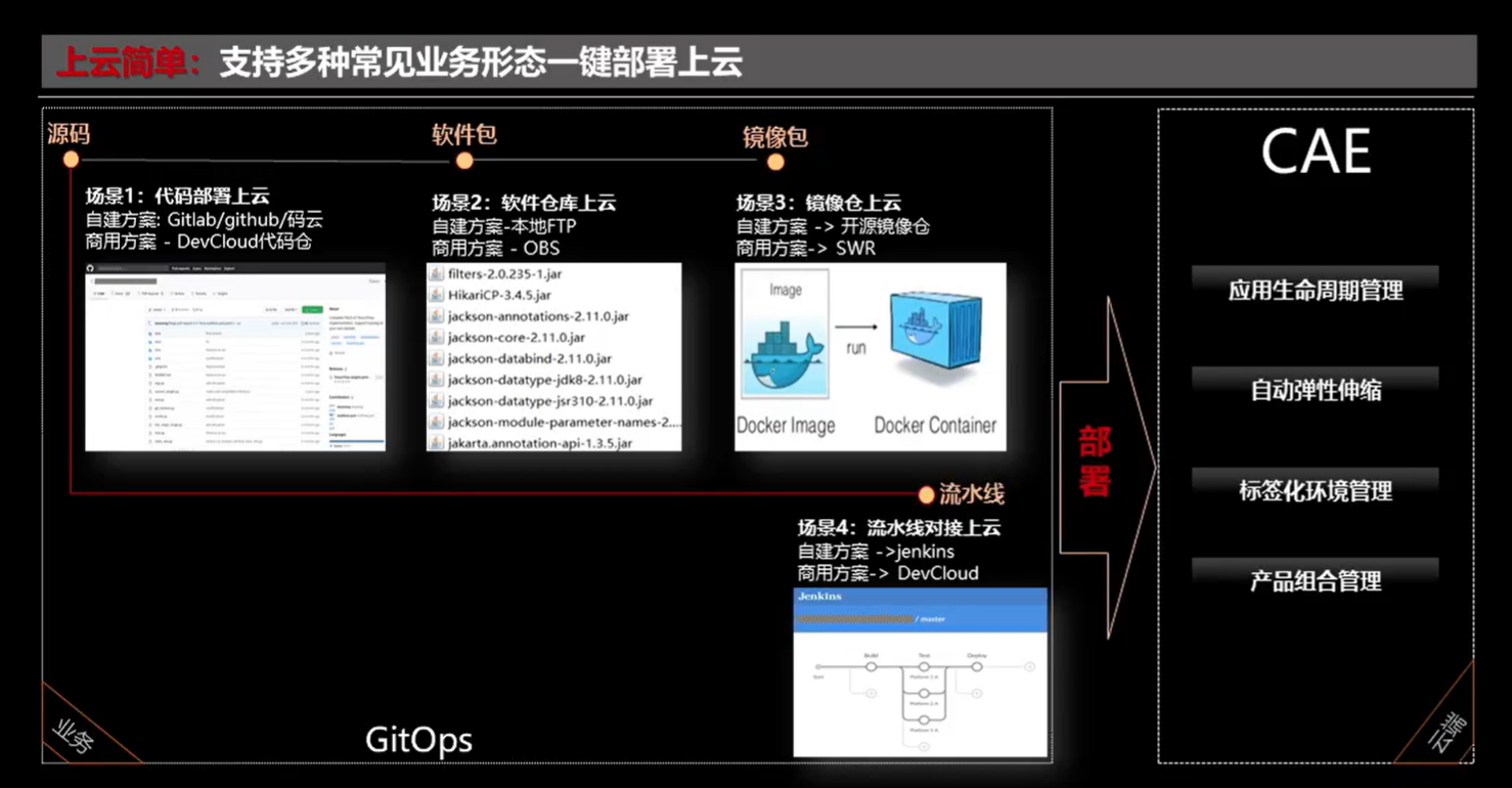 支持多种常见业务形态一键部署上云。部署在华为云应用引擎CAE中,进行应用生命周期管理、自动弹性伸缩、标签化环境管理、产品组合管理等。