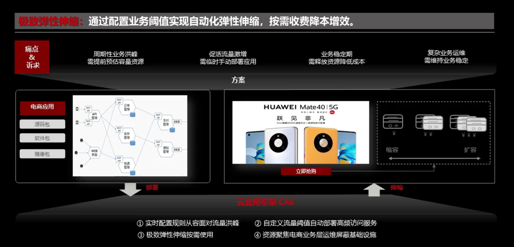 通过配置业务阈值实现自动化弹性伸缩,按需收费降本增效。