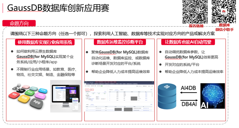说到比赛,核心当然是命题了。产业赛道的设置,目的是为了推进赛事组织的线上线下融合,推进高校创新创业教育与破解产业实际技术难题相结合,真正落实大赛“以赛促教,以赛促学,以赛促创”的重要任务。作为产业赛道的重要命题之一,华为云GaussDB命题深度融合“产、学、研、用”的技术创新体系,以此次教育部发起的互联网+大赛为载体,加强与高校、初创企业的创新合作,设置了GaussDB数据库创新应用赛。为了激发学生们的无限潜能,本次命题设计秉承开放包容的思想,不做太多的约束,而是提供基础平台和指引,让参赛者充分发挥想象力来设计、实现,下设了“使用数据库实现行业应用系统”、“数据库运维监控诊断平台”、“让数据库也能AI自动驾驶”三个命题方向,参赛者可以自由选择,基于GaussDB、人工智能等云计算技术探索对应方向的产品或解决方案。