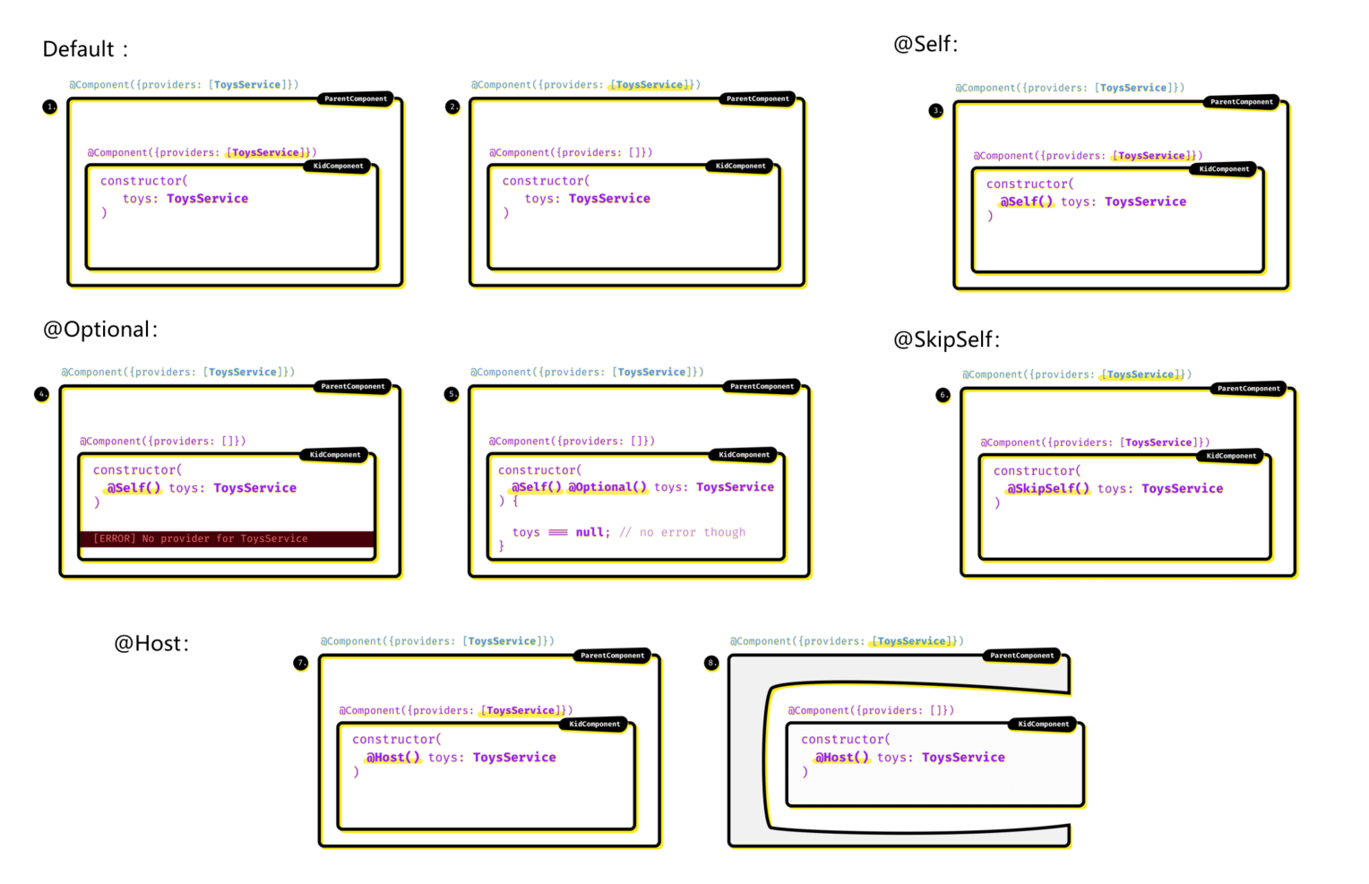 这里有一篇文章《@Self or @Optional @Host? The visual guide to Angular DI decorators.》非常生动形象地展示父子组件间如果使用了不同的装饰器,最后会命中的实例有什么不同。