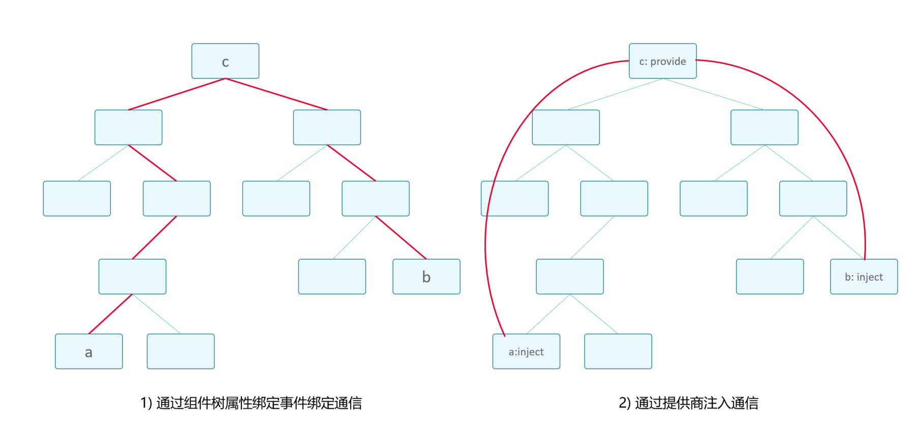左图只通过父子组件传递信息,节点a和节点b进行通信就需要经过诸多节点;如果节点c想要通过一些配置控制节点b,他们中间的节点也必须设置额外的属性或者事件来透传对应的信息。右图的依赖注入模式节点c可以提供一个供节点a、b通信的服务,节点a直接和节点c提供 服务通信,节点b也直接和节点c提供的服务通信,最后通信就被简化了,中间节点也没有耦合该部分内容,对上下层组件发生的通信无明显的感知。