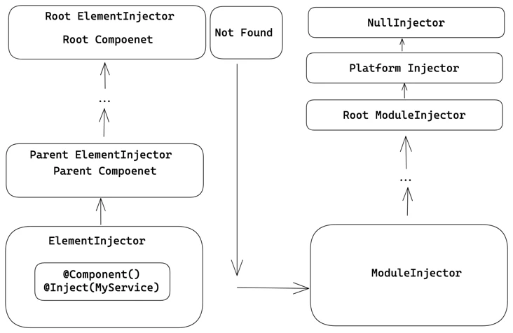 也就是说组件/指令以及在组件/指令层级提供注入内容会优先在组件视图中元素里寻找依赖一直到根元素,如果没有找到则接着在元素当前所在模块,引用(包含模块引用和路由懒加载引用)该模块的父级模块一次往上找直到根模块和平台模块。