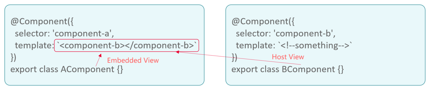 Host在这里是宿主的意思,@Host这个装饰器将会限定查询的范围在宿主元素(host element)以内。什么是宿主元素呢?假如B组件是A组件模板使用的组件,那么A组件实例就是B组件实例的宿主元素。组件模板产生的内容称为View(视图),同一个View对于不同组件来说可能是不同视图。如果A组件在自己的template范围内使用B组件(见图4),A的模板内容形成的视图(红框部分)对A组件来说就是A的内嵌视图,B组件在这个视图内,所以对B来说这个视图就是B的宿主视图。装饰器@Host就是限定搜索范围为宿主视图之内,找不到不会再进行冒泡了。