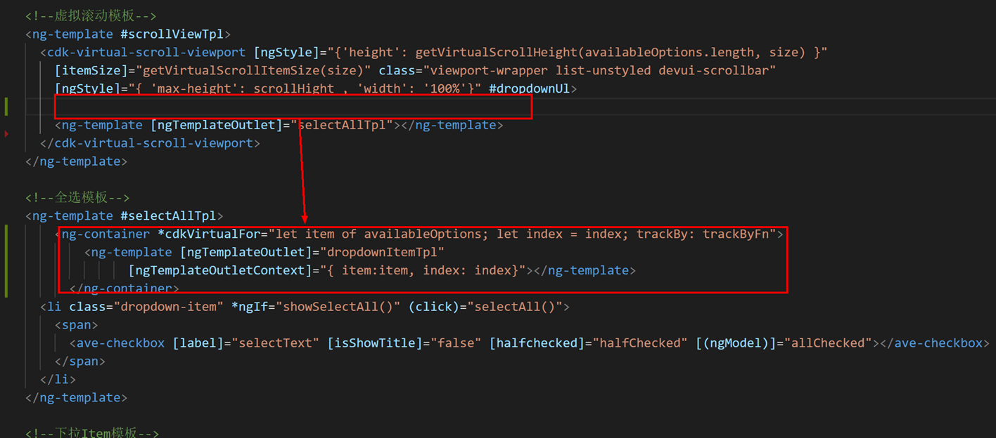 通常我们多个地方使用同一个模板的时候,会通过 template 提取公共部分,之前 DevUI Select组件开发的时候开发者想将共用的部分抽取出来报错了。