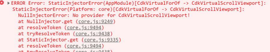 这里是由于 CdkVirtualScrollFor指令需要注入一个CdkVirtualScrollViewport,然而元素注入injector继承体系是继承静态AST关系的DOM,动态的不行,所以发生以下查询行为,查找后报失败。