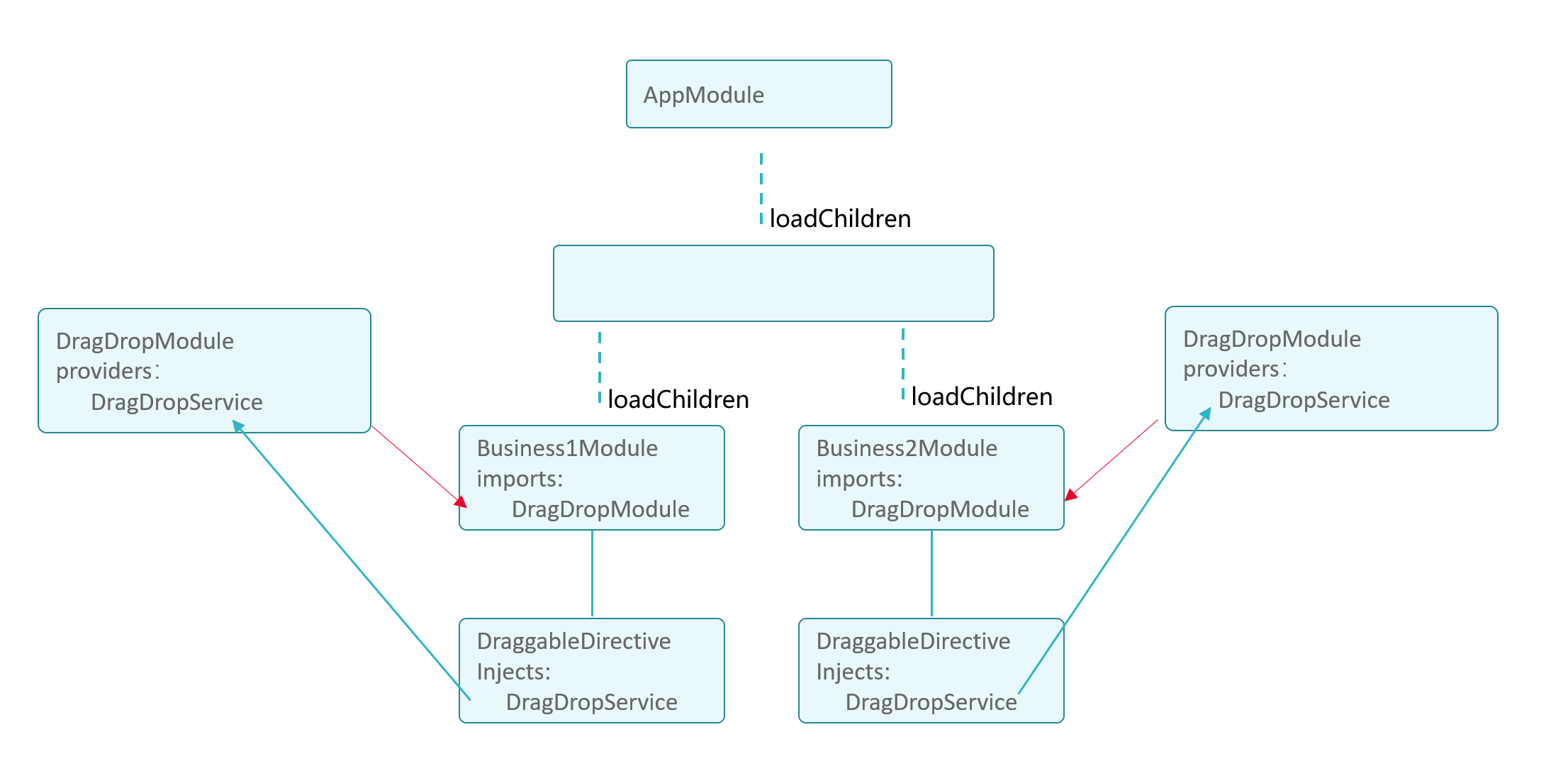 内部的业务平台有涉及跨多个模块的拖拽,由于涉及了loadChildren懒加载,每个模块会单独打包DevUI组件库的DragDropModule,该Module提供了一个DragDropService。拖拽指令分为可拖起指令Draggable和可放置指令Droppable,两个指令通过DragDropService进行通信。 本来引入同一个模块使用模块提供的Service是可以通信的,但是懒加载后DragDropModule模块被打包了两次,也对应产生两份隔离的实例。这时候处于一个懒加载模块里的Draggable指令就无法与另一个懒加载模块里的Droppable指令进行通信了,因为此时DragDropService并不是同个实例了。