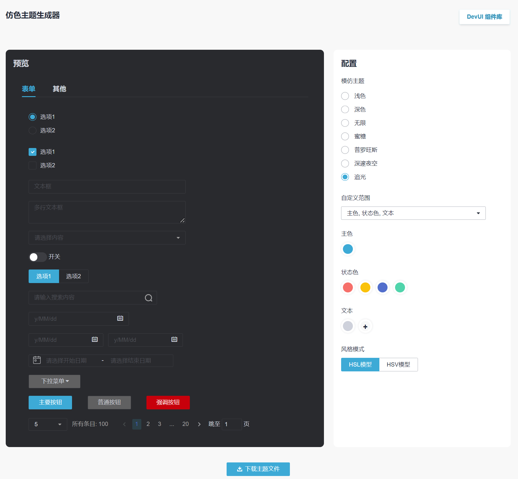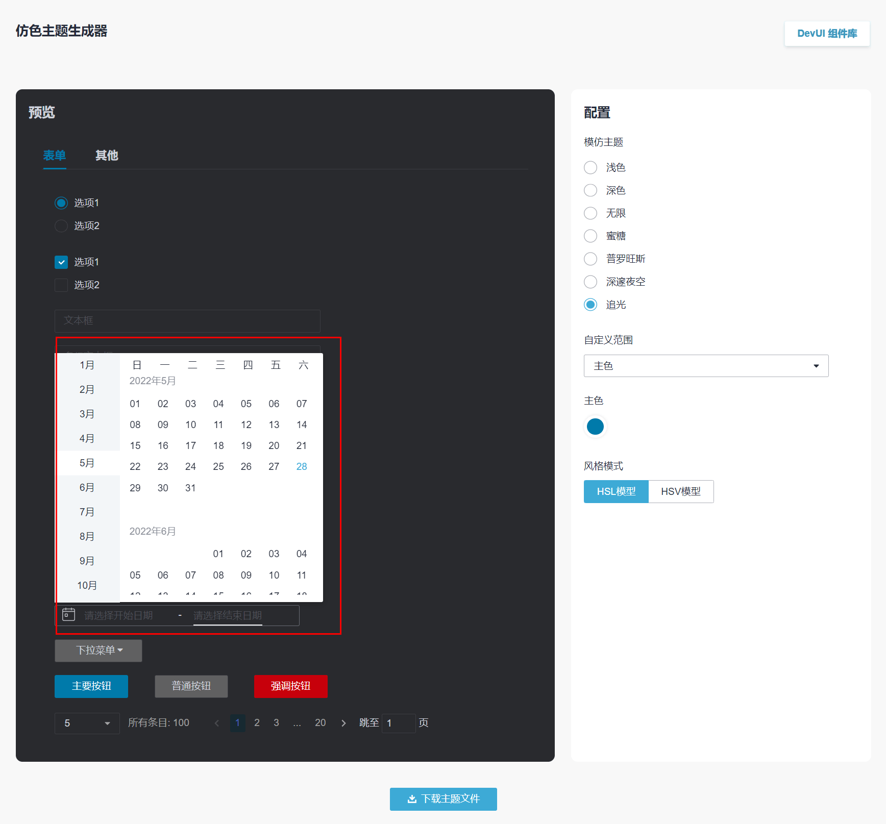 DevUI组件库的主题化是使用了CSS自定义属性(css变量)声明:root的css变量值从而实现了主题切换。如果我们要在一个界面内同时展示不同主题的预览,我们可以在DOM元素局部重新声明css变量从而达到局部主题的功能。之前在做主题仿色生成器的时候就用了这样一个办法来是局部应用一个主题。