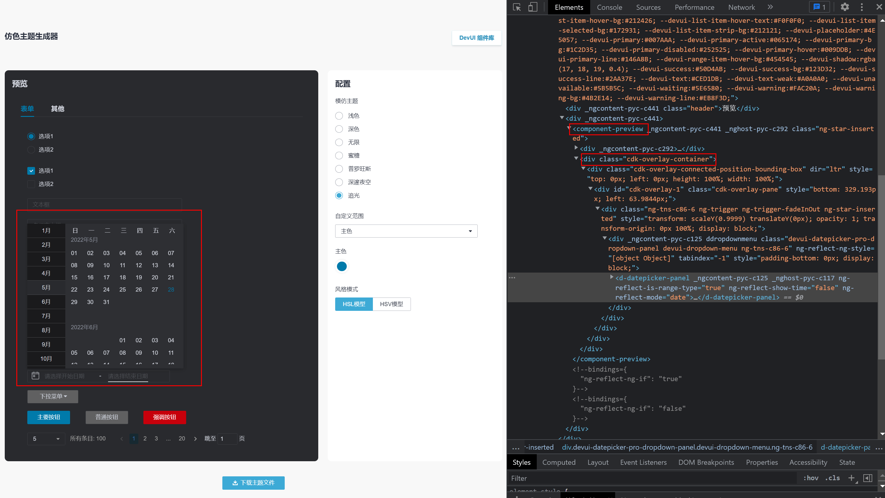 图21 cdk的Overlay容器被附着到指定的dom内部, 局部主题预览成功