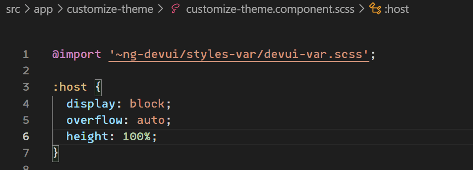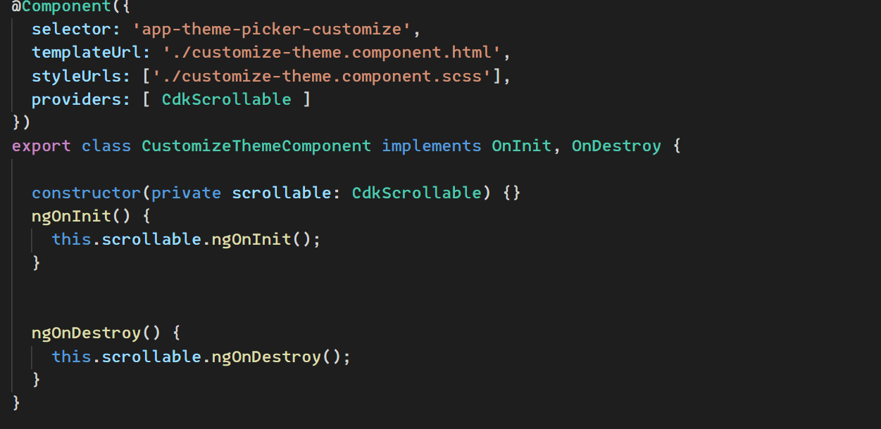 这样我们就遇到了一个比较难搞的问题,模块是router定义指定过来的,也就是没有任何地方显式地调用<app-theme-picker-customize></app-theme-picker-customize>,那cdkScrollable指令该怎么加进去呢?解法如下,这里隐藏掉了部分代码只留下核心代码。