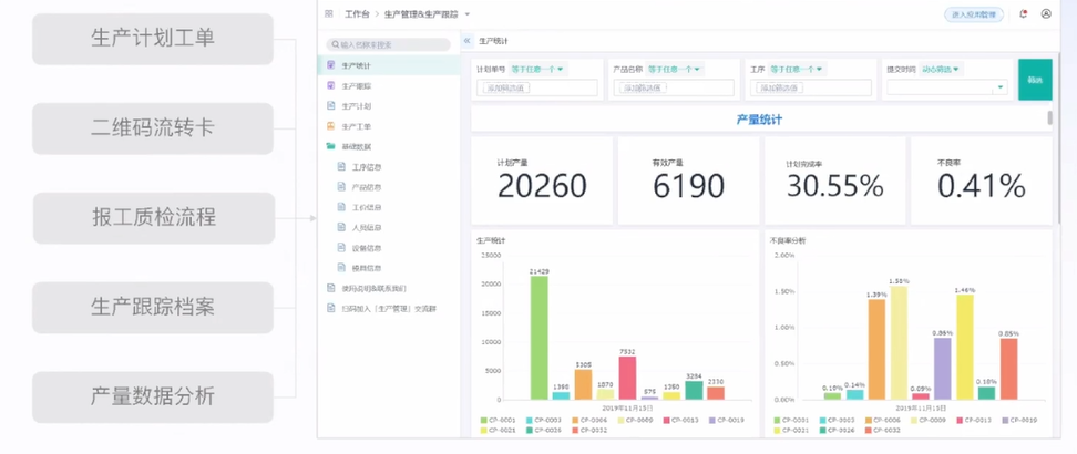生产报工和追踪包括班组名册、工序文档、产量统计、计件工资、生产计划、计划跟踪、扫码报工、扫码质检等。