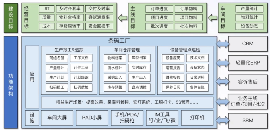 条码工程的建设这里提供一个完整的功能架构,包括应用部分和设施部分。通过功能架构可以实现一定的建设目标:经营目标、主线目标、车间目标。