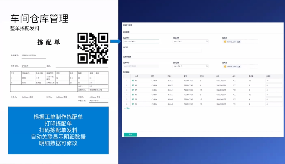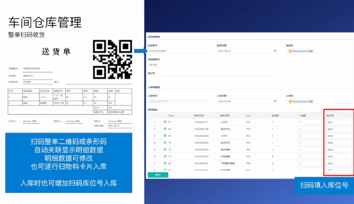 车间仓库管理除了送货,扫码入库还需要整单拣配单 。