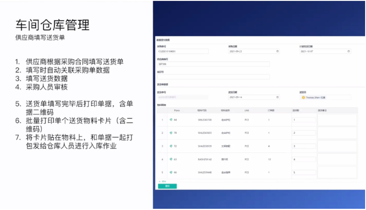 车间扫码出入库完成了对车间仓库的管理。如下图所示,通过表单完成供应商填写送货单,采购人员审核等操作,提前完成入库前的一系列工作,帮助一线工作人员减轻工作负担和完成入库数据化管理。