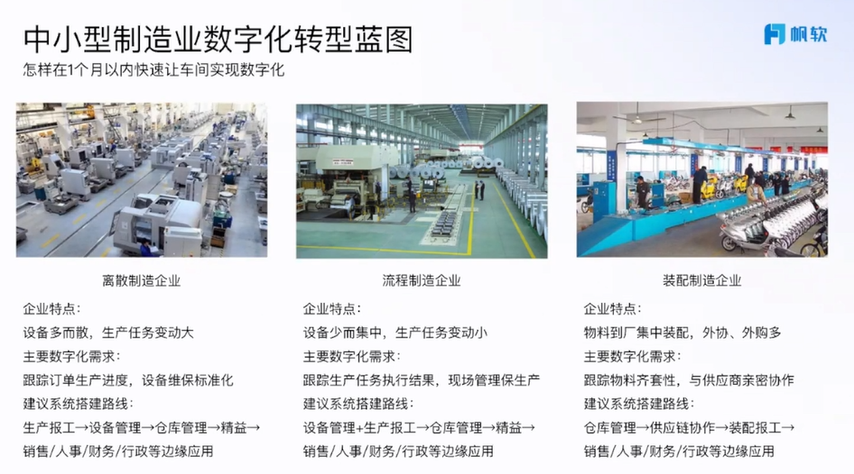 中小企业的数字化转型针对的企业类型有离散制造企业,流程制度企业,装配制造企业。他们读需要各自的数字化转型。