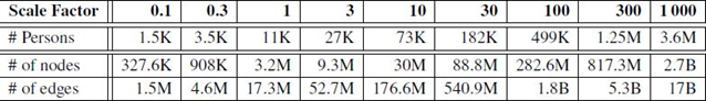 LDBC SNB支持生成不同规模的图数据集,generator.scaleFactor参数各取值对应的点边数目如下表: