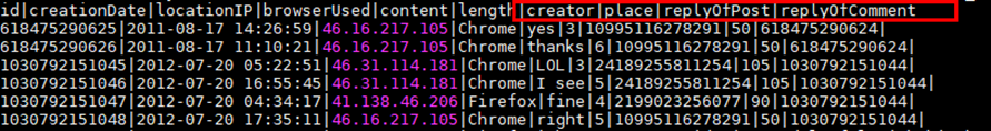 图五 comment-hasCreator->personcomment-isLocatedIn->placecomment-replyOf->postcomment-replyOf->comment关系与comment属性文件合并