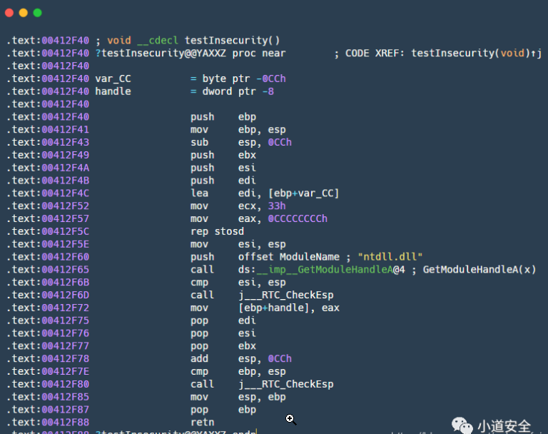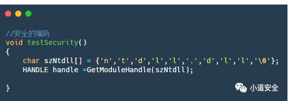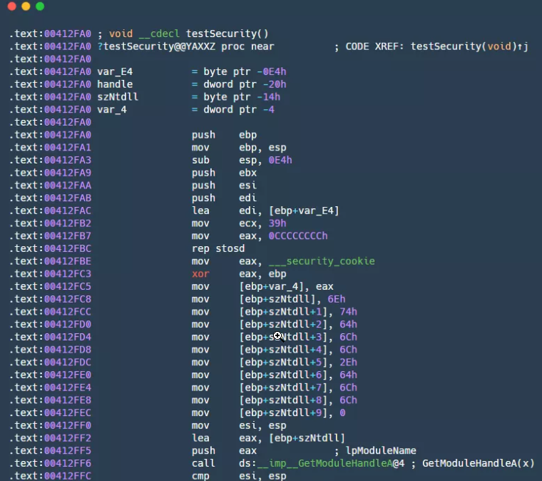 下图可以很清晰的看懂字符串信息”ntdll.dll”,这样就把代码的字符串信息直接暴露给大家,这样大家就可以通过字符串信息做一些对代码不安全的事情了。